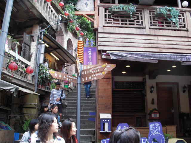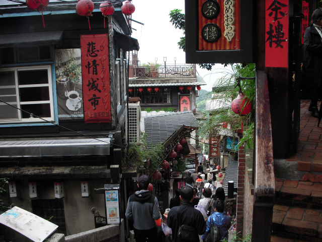 九份は、急斜面の細い通路沿いにたくさんのお店がひしめき、